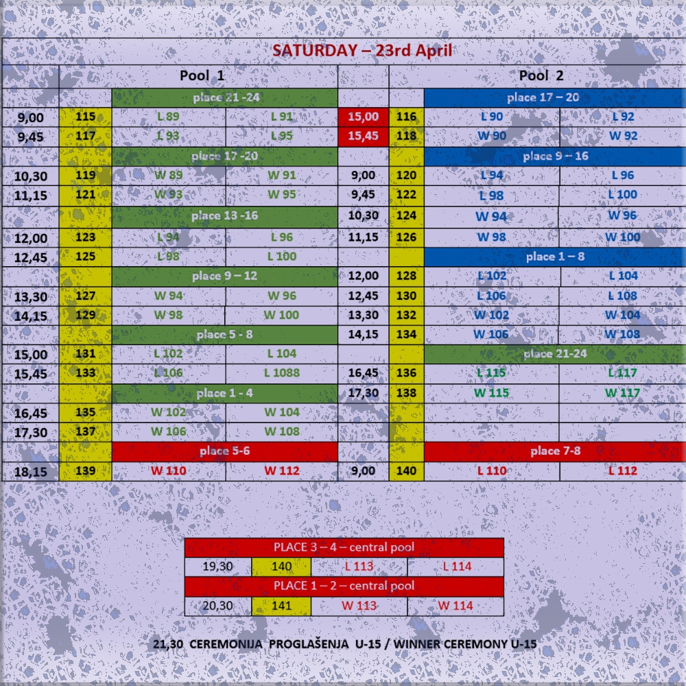 In U-15 category 8 team will be split in 2 groups by 4. 1st and 2nd will play in semifinals while 3rd and 4th will play for places 5 – 8.