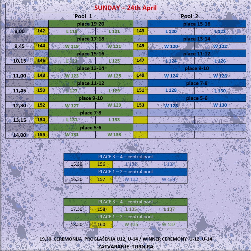 For the U-12 category we have 4 groups of 5 teams. After 5 rounds first two from each groups advance to quarterfinals, 3rd and 4th play for 9 – 16 place, while 5th teams play for places 17 – 20.
